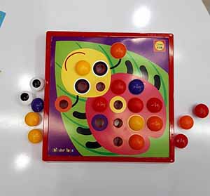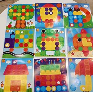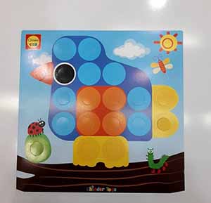 شامل یک صفحه پایه، 12 کارت تصویر رنگی سوراخ دار و 46 دکمه رنگی پین دار